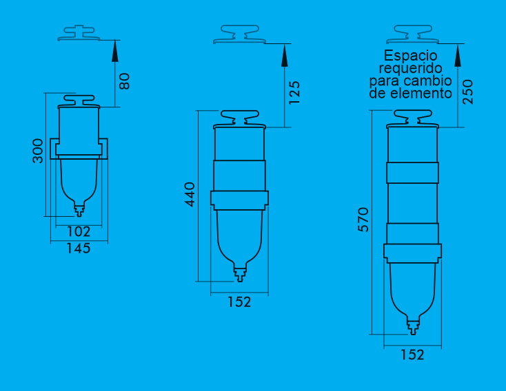 - Separador de agua: turbina deflectora de agua y recipiente colector con purgador.