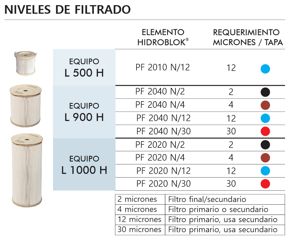 - Cartuchos: filtros descartables que se aplican según el requerimiento (disponibles en 30, 12, 4 y 2 micrones).